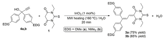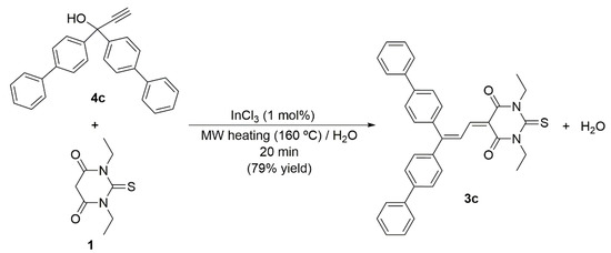 The synthetic utility of this MW-assisted InCl3-catalyzed process was further demonstrated with the preparation of the novel butadiene 5-(3,3-bi([1,1’-biphenyl]-4-yl)allylidene)-1,3-diethyl-2-thioxodihydropyrimidine-4,6(1H,5H)-dione 3c starting from stoichiometric amounts of 1,3-diethyl-2-thiobarbituric acid 1 and 1,1-di([1,1’-biphenyl]-4-yl)prop-2-yn-1-ol 4c (Scheme 5). Compound 3c was isolated as a red solid in 79% yield and characterized by 1H and 13C{1H] NMR, IR, elemental analysis and HRMS, with all data being fully consistent with the proposed formulation (full details are given in the Materials and Methods section and copies of the spectra included in the Supplementary Materials). Thus, its IR spectrum showed characteristic C=O vibrations appearing as a strong and broad absorption band at 1667 cm−1. The generation of a butadiene >C=CH-CH=C< unit was clearly reflected in the 1H NMR spectrum by the appearance of two doublet signals at 8.30 and 8.73 ppm (3JHH = 12.3 Hz), the spectrum also showing the typical signals for the two inequivalent ethyl groups of the N-alkylated thiobarbituric acid skeleton, i.e., two quartets at δH 4.54 and 4.62 ppm and two triplets at δH 1.31 and 1.38 ppm for the CH2 and CH3 units, respectively (3JHH = 6.9 Hz). The 13C{1H] NMR spectrum of 3c also showed the expected signals, with the most quickly identifiable being that of the C=S unit, which appears as the most deshielded one in the spectrum (δC 178.9 ppm).