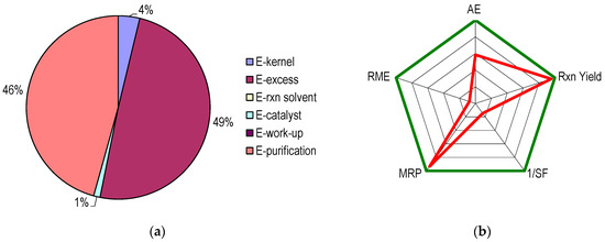 (a) E-factor profile; (b) radial-pentagon diagram with metrics (%): reaction yield, atom economy (AE), reaction mass efficiency (RME), materials recovery parameter (MRP), inverse of stoichiometric factor (1/SF).