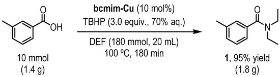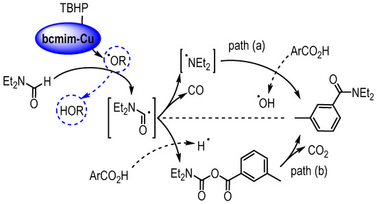 Regarding the mechanism, it has been previously reported that radicals are involved in as intermediates [11]. A possible mechanism (Scheme 2) starts with the formation of radical initiators from the TBHP mediated by the catalyst (bcmim-Cu). The initial radical interacts with the formamide generating the N,N-diethylcarbamoyl radical, which can evolve via to possible pathways. In path (a), decarbonylation of the carbamoyl radical forms the diethylaminyl radical, which reacts with the acid to form the product. In path (b), N,N-diethylcarbamoyl radical reacts with the acid to form N,N-diethyl carbamic 3-methylbenzoic anhydride, which releases CO2 to produce the final amide.