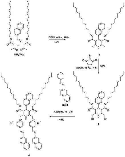 The desired target product-1,1′-{[3,5-bis(dodecyloxycarbonyl)-4-(naphthalen-2-yl)-1,4-dihydropyridine-2,6-diyl]bis(methylene)}bis{4-[(E)-2-(naphthalen-2-yl)vinyl]pyridin-1-ium} dibromide 4 was synthesized via a multistep procedure. Firstly, three component Hantzsch-type reactions of dodecyl acetoacetate, 2-naphthaldehyde and ammonium acetate in ethanol under reflux for 48 h gave didodecyl 2,6-dimethyl-4-(naphthalen-2-yl)-1,4-dihydropyridine-3,5-dicarboxylate 1 with a 40% yield. Bromination of 2- and 6-methyl groups at the 1,4-DHP 1 was performed by N-bromosuccinimide (NBS) similarly to the previously described procedure [23]. To a solution of 2,6-dimethyl-1,4-DHP 1 in methanol was added NBS in a single portion with the reaction then stirred at 45 °C for 1h. The desired 2,6-bis(bromomethyl)-1,4-DHP 2 was obtained with a 68% yield. The last step—nucleophilic substitution of bromine with (E)-4-(2-(naphthalen-2-yl)vinyl)pyridine (3)—was performed in acetone for 3 days giving the target 1,1′-{[3,5-bis(dodecyloxycarbonyl)-4-(naphthalen-2-yl)-1,4-dihydropyridine-2,6-diyl]bis(methylene)}bis{4-[(E)-2-(naphthalen-2-yl)vinyl]pyridin-1-ium} dibromide 4 with a 45% yield. Synthesis of 4-(1-naphthylvinyl)pyridine 3 was performed according to the reported method [24,25]. According to the literature, the reaction of 4-methylpyridine with 2-naphthaldehyde leads to the formation of E-isomer of compound 3 almost exclusively [25].