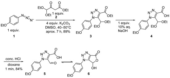 - Pokhodylo, N.T.; Shyyka, O.Y.; Obushak, M.D. Convenient synthetic path to ethyl 1-aryl-5-formyl-1H-1,2,3-triazole-4-carboxylates and 1-aryl-1,5-dihydro-4H-[1,2,3]triazolo[4,5-d]pyridazin-4-ones. Chem. Heterocycl. Compd. 2018, 54, 773–779. [Google Scholar] [CrossRef]
