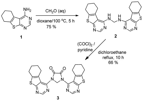 In conclusion, a hybrid compound 3, thieno[2,3-d]pyrimidine derivative 3 bearing a 4,5-imidazolidinedione moiety was synthesized efficiently by the reaction of N,N′-bis(5,6,7,8-tetrahydrobenzo[4,5]thieno[2,3-d]pyrimidin-4-yl)methanediamine 2 with oxalyl chloride in the presence of pyridine in refluxing dichloroethane. This thieno[2,3-d]pyrimidine derivative could be used as a useful component of biologically active molecules for drug development.