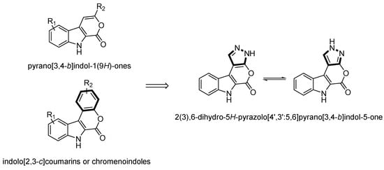 Based on these studies, it was speculated that combining the unique indolo-coumarin scaffold with the pyrazole moiety could have a substantial impact on the activity of the compounds. Prompted by the data mentioned above, we decided to further examine these two scaffolds and we present herein the synthesis of 3,6-dihydro-5H-pyrazolo [4′,3′:5,6]pyrano [3,4-b]indol-5-one (Figure 1). In this compound, the phenyl ring of indolo [2,3-c]coumarin is replaced by the pyrazole moiety to gain a better insight into the structure–activity relationship. The donor–acceptor group and the existence of tautomeric forms on the pyrazole ring are considered to contribute to the formation of essential interactions with several protein targets of high biological significance.