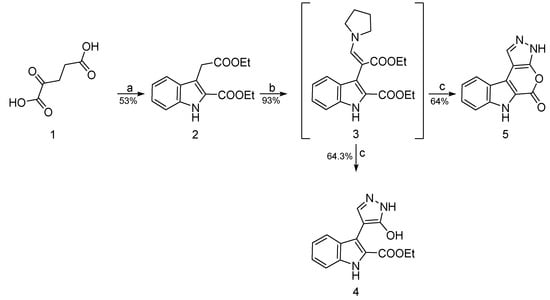 Pyrazolo compound 4 and pyrazolopyranoindole 5 were isolated in pure forms by column chromatography and unambiguously identified by 1H and 13C NMR spectra (see Supplementary Materials), using direct and long-range heteronuclear correlation experiments (HMBC and HMQC). In both compounds 4 and 5, the signals of the pyrazole group in the 1H NMR spectra were the primary indication that the pyrazole moiety was incorporated. More specifically, 1H NMR spectra showed a characteristic singlet at 7.60 and 7.69 ppm, respectively. The structural discrimination of the two compounds resulted from the absence of the characteristic chemical shifts of the ethyl ester group in compound 5 in the 1H NMR spectra (see Supplementary Materials). The HRMS of 4 and 5 were also obtained to further confirm the proposed structures determined by the NMR spectra.