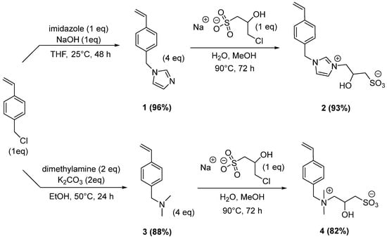 Recently, our team has developed new efficient approaches to functionalized ionic monomers for their use in epoxy resins [11,12]. Here, we describe a simple two-step sequence from imidazole or dimethylamine and sodium-3-chloro-2-hydroxypropane-1-sulfonate for the preparation of zwitterionic monomers bearing a styrenic moiety (Scheme 1). In this strategy, we used 4-vinylbenzylchloride as an inexpensive and, particularly reactive, starting material. Firstly, we added a stoechiometic amount of imidazole in the presence of powdered sodium hydroxide (1 eq) in THF. After 48 h at room temperature, the crude mixture was poured in water, and 4-vinylbenzylimidazole 1 was extracted by dichloromethane to provide an excellent yield of 96%. NMR analysis confirmed the alkylated imidazole derivative 1, with no purification required at this step. The quaternarization of the imidazole 1 was performed by reaction with sodium 3-chloro-2-hydroxypropane-1-sulfonate hemihydrate in a mixture of water/methanol (1/1). To optimize this second alkylation, we dissolved the sulfonate in water at room temperature. This aqueous solution was added to imidazole 1 in methanol, and the resulting mixture was heated at 90 °C for 72 h. With one-and-one-half eq of imidazole 1, a poor conversion of 60% was obtained after 72 h. After the reaction, we tested the purification of the crude mixture using Amberlite MB-6113 H+/OH− mixed resin. To this end, the crude monomer was precipitated in ethyl acetate and dissolved in water. Then, the mixed-bed ion-exchange resin was added, and the suspension was stirred at room temperature until the disappearance of sodium 3-chloro-2-hydroxypropane-1-sulfonate (followed by 1H NMR spectroscopy). The resin was filtered. Then, water was removed under reduced pressure; finally, the residue was dried in vacuo. This protocol afforded a purified product, but a significant loss of mass was observed.