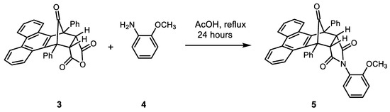 Phencyclone 1 readily reacts with maleic anhydride 2 in refluxing benzene or toluene, however, toluene was preferred for use in this work. The reaction is usually complete within 20–30 min, the end point is readily identified since phencyclone forms a dark green solution in toluene, which fades as the starting material is consumed. Phencyclone can be purchased from commercial suppliers, alternatively, it can easily be prepared from 1,3-diphenylacetone and 9,10-phenanthraquinone [7,8]. Cycloadduct 3 can be stored in a cool, dark place for several years without significant decomposition, however, it is not stable if heated to melting point. Under these conditions, decomposition will occur, and the vigorous release of CO gas will take place as soon as the melting point is reached [1]. The stability of 3 is also limited if stored in hygroscopic solvents, on prolonged storage, the hydrolysis of the cyclic anhydride can take place.