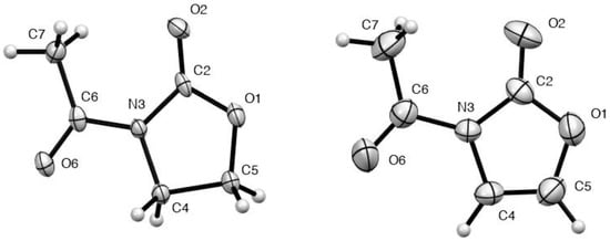 In summary, the X-ray crystal structures of the two simple N-acetyl heterocycles 1 and 3 have been obtained for the first time and are compared with each other and with related literature structures. In the case of the deacetylated oxazolin-2(3H)-one 4 disorder between the positions of the ring O and NH resulted in a very high R factor meaning no accurate structural information could be obtained.
