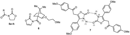 A further point to note is that, in both 1 and 3, the nitrogen is quite accurately planar with its two adjacent carbonyl groups aligned anti to one another. A survey of a range of simple N-acyloxazolidiones 5ah for which X-ray structures have been published (Table 2, [12,13,14,15,16,17,18,19]) shows that while planarity at nitrogen is the norm, the degree of anti alignment of the two carbonyls varies, with torsion angles as low as 149–154° in some cases. The structure of the only previously determined N-acyloxazolin-2(3H)-one 6 (Figure 2) agrees well with that of 3 in these respects [8].