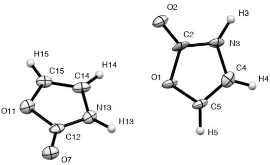 When we come to the parent oxazolin-2(3H)-one 4, the structure solution raised an unexpected problem. The structure consisted of two independent molecules with very similar geometries (Figure 3) but the R factor was very high due to disorder in the crystal between the location of O(1)/N(3)H(3) or O(11)/N(13)H(13). This is especially significant since, with correct alignment, there is strong hydrogen bonding between these and in fact the crystal structure consists of alternating rows of hydrogen bonded dimers of the two independent molecules exhibiting an R22(8) interaction [20] (Figure 4, Table 3).