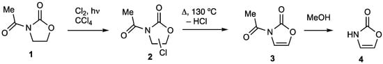 The starting N-acetyloxazolidin-2-one 1 was readily prepared by reaction of oxazolidin-2-one with acetic anhydride in the presence of catalytic sodium acetate [6]. Oxazolidin-2-one itself is commercially available and can also be easily prepared from ethanolamine and diethyl carbonate [6]. The chlorination [5,6] proceeded readily to give 2 as a mixture of regioisomers as confirmed by the NMR data [7]. Simply heating this under an inert atmosphere led to efficient loss of HCl and formation of the oxazolinone 3 [5,6]. The final deprotection of nitrogen was accomplished in low yield by methanolysis [5,9], to give a sample of 4 whose identity was confirmed by comparison of its 1H NMR data (see Supplementary Materials) with literature values for samples prepared using the route of Scheme 1 [5] and a completely independent method [10].