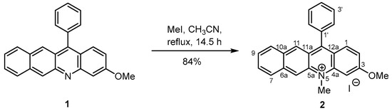 3.2. Synthesis of 3-Methoxy-5-methyl-12-phenylbenzacridinium Iodide (2)