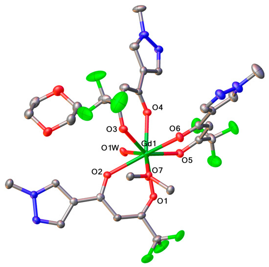 Pyrazole substituted 1,3-diketones are a new and promising class of heterocyclic 1,3-diketones with isolated pyrazole moiety [1,2,3]. Due to the presence of additional coordination sites in the molecule (“pyridine-like” N(2) atom of pyrazole fragment), they may be interesting as ligands for the construction of supramolecular ensembles such as coordination polymers of different degree of dimensionality [4,5,6]. Usually, most of efforts are focused on synthesis of complexes with higly-luminescent lanthanide ions such as Eu3+, Tb3+, Sm3+ or Yb3+ [7,8,9], but role of non-luminescent Gd3+ complexes are also very important. Since the energy of resonant 6P7/2 level in Gd3+ ion is much higher (~31,000 cm−1) than the energy of the first triplet level (T1) of most organic ligands, no energy transfer between ligand and Gd3+ is possible; instead, only phosphorescence of ligands can be observed especially under low (77 K) temperatures. Consequently, Gd3+ complexes are a useful tool for the determination of T1 energy levels in coordination compounds [10]. Recently, we have introduced [6] 4,4,4-trifluoro-1-(1-methyl-1H-pyrazol-4-yl)butane-1,3-dione (HL, 1) as a new ligand for the coordination chemistry of lanthanides, but simple hydrated complex [Gd(L)3(H2O)2] was not fully characterized up to now. Here, we wish to report on synthesis and the crystal structure of more a complex molecule—[(Gd2(L)3(H2O))2(C4H8O2)]•2(C4H8O2), where C4H8O2 is 1,4-dioxane. This complex is pretty stable and can be isolated in pure crystalline form.