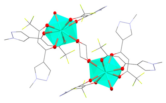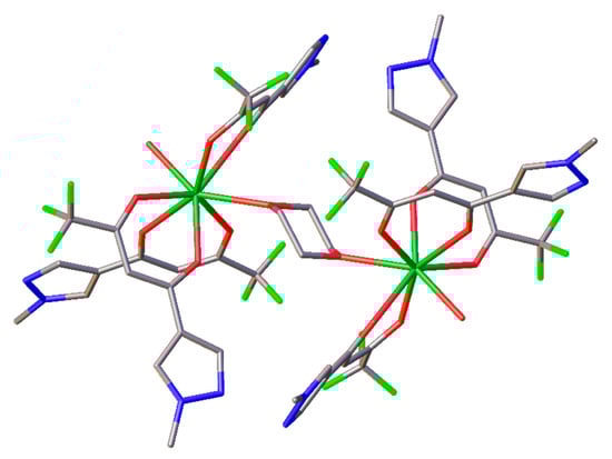 All reagents were purchased form Aldrich (St. Louis, MO, USA) and were used without further purification. Ligand - 4,4,4-trifluoro-1-(1-methyl-1H-pyrazol-4-yl)butane-1,3-dione (1) was synthesized according previously published procedure [13]. Elemental analysis was performed by Laboratory of Microanalysis of Nesmeyanov Institute of Organoelement compounds (Moscow, Russian Federation). FTIR spectra were recorded in KBr pellets on Perkin Elmer Spectrum One instrument (Santa Barbara, CA, USA). Single-crystal X-ray diffraction analysis was carried out on a Bruker D8 Quest diffractometer (Bruker AXS Handheld Inc., Kennewick, WA, USA), MoKα radiation, ω and φ-scan mode. Single X-ray diffraction analysis was carried out on a Bruker D8 Quest diffractometer (MoKα radiation, ω and φ-scan mode). The structure was solved with direct methods and refined by least-squares method in the full-matrix anisotropic approximation on F2. All hydrogen atoms were located in geometric positions and refined freely. All calculations were performed using the SHELXTL [14,15] and Olex2 [16] software packages. Crystal Data for C60H64F18Gd2N12O20 (M = 1929.73 g/mol): triclinic, space group P-1 (no. 2), a = 13.3891(7) Å, b = 13.5291(7) Å, c = 16.1602(7) Å, α = 86.016(2)°, β = 66.320(2)°, γ = 62.099(2)°, V = 2343.7(2) Å3, Z = 1, T = 110(2) K, μ(MoKα) = 1.499 mm-1, Dcalc = 1.367 g/cm3, 23351 reflections measured (2.78° ≤ 2Θ ≤ 58.00°), 12294 unique (Rint = 0.0564, Rsigma = 0.0910) which were used in all calculations. The final R1 was 0.0446 (I > 2σ(I)) and wR2 was 0.0974 (all data). Atomic coordinates, bond lengths, angles, and thermal parameters have been deposited at the Cambridge Crystallographic Data Centre with deposition number CCDC 2201754, which is available free of charge at www.ccdc.cam.ac.uk.