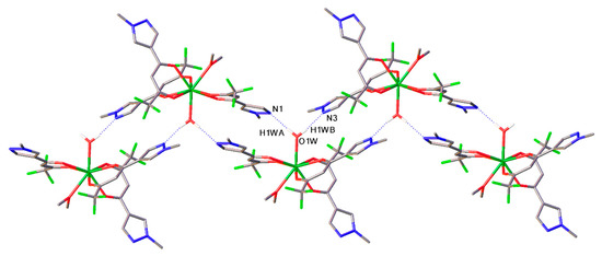 The analysis of crystal packing of 2 reveals the presence of hydrogen bonds O1W-H…N (O1W…N1 distance is 2.80 Å, O1W…N3 distance is 2.79 Å) leading to the 2 packing in the form of linear polymeric chains, as illustrated in Figure 4.