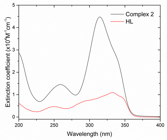 The UV absorption spectra for HL (1) and complex 2 were recorded in an MeCN solution at an ambient temperature (Figure 5). They all exhibit the spin-allowed broad bands corresponding to the π → π* transitions in the ligands. The observed maxima at 259 and 314 nm nm can be assigned to the absorption of pyrazole aromatic system and conjugated diketone fragment, respectively. Based on the spectral data, one can conclude that the chemical bonding of ligands with Gd3+ ion lead to a significant enhancement of the molar extinction. In contrast to the weakly absorbing hydrated Gd3+ ion (ε~10 M−1 cm−1), the molar absorption coefficients for the complexes are approximately in 103 times higher and reach 2–6 × 104 M−1cm−1.