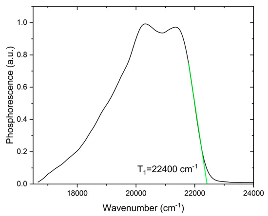 The energy of first triplet level of the ligand 1 was determined from the phosphorescent spectrum of 2 at 77 K. Since the energies of S1 and T1 levels of aliphatic molecules are much higher than for aromatic one, for the complex 2, the T1 level (the lowest one) de facto is associated only with diketonate fragment of the binuclear complex. Other ligands such as H2O or dioxane do not interfere with the determination of the triplet level energy from the phosphorescence spectrum [11]. The tangent method [10] was used to determine the T1 energy level and it was found to be 22,400 cm−1 (Figure 6).