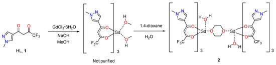 Synthesis of (Diaqua)hexakis(4,4,4-trifluoro-1-(1-methyl-1H-pyrazol-4-yl)butane-1,3-dionato-κ2O,O’)(μ-(1,4-dioxane))digadolinium (III), Solvate with Two Molecules of 1,4-Dioxane, Complex 2