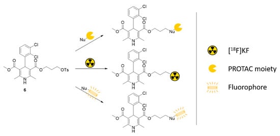 The 1,4-DHPs exert their pharmacological activity mainly by binding to voltage-gated calcium channels (LTCCs). Given their selectivity toward LTCCs, compounds having a 1,4-DHP core have been employed as tracers in radioligand binding assays and positron emission tomography, mostly bearing 3H and 11C isotopes []. Despite the inherent advantages of 18F-labeled tracer candidates, 18F-labeled 1,4-DHPs are rarely described [], most probably owing to synthetic challenges in accessing these structures. The most straightforward route to radiolabel Csp3 carbon bonds relies on the use of precursors bearing optimal leaving groups such as tosylates, that would readily undergo SN2 reactions in the presence of nucleophiles.