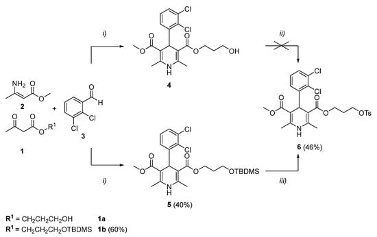 The synthetic pathways toward the synthesis of 6 involve the synthesis of the 1,4-DHP scaffold through an MCR and derivatization toward the final product. (i) MeOH; (ii) Tosyl chloride, Et3N, DCM; (iii) Tosyl fluoride, base, CH3CN.