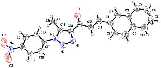 Claisen–Schmidt condensation of 2-naphthaldehyde (1) and 1-(5-methyl-1-(4-nitrophenyl)-1H-1,2,3-triazol-4-yl)ethan-1-one (2) in ethanolic sodium hydroxide at 20 °C for 4 h gave (E)-1-(5-methyl-1-(4-nitrophenyl)-1H-1,2,3-triazol-4-yl)-3-(naphthalen-2-yl)prop-2-en-1-one (3) in 92% yield (Scheme 1). Nuclear magnetic resonance (NMR) spectroscopy (Section 2.2.) and single-crystal X-ray diffraction (Section 2.3) were used to confirm the identity of 3.