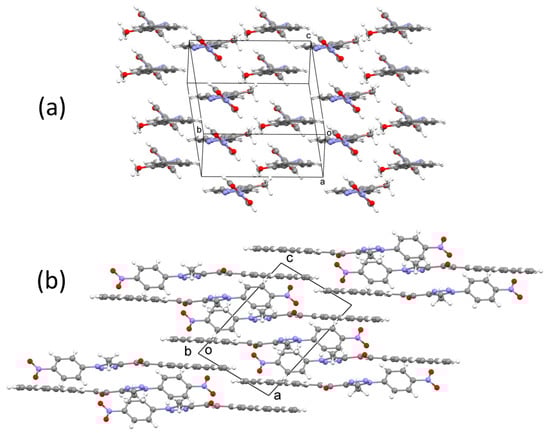 In the crystal, the nitrobenzene groups (D) of all the molecules are parallel to the (1 3 −2) crystallographic plane, as is clearly visible in Figure 2a. Additionally, the planes of the A–C groups are aligned parallel to the (1 0 −2) crystallographic plane of the crystal (Figure 2b).
