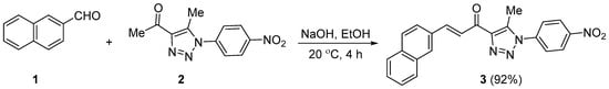 A reaction of equimolar equivalents of 2-naphthaldehyde (1) and 1-(5-methyl-1-(4-nitrophenyl)-1H-1,2,3-triazol-4-yl)ethan-1-one (2) in ethanolic sodium hydroxide at 20 °C for 4 h gave (E)-1-(5-methyl-1-(4-nitrophenyl)-1H-1,2,3-triazol-4-yl)-3-(naphthalen-2-yl)prop-2-en-1-one (3) in 92% yield. Nuclear magnetic resonance spectroscopy and single-crystal X-ray diffraction were used to establish the structure of 3.