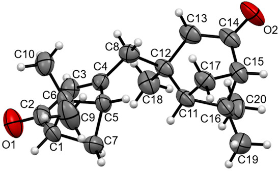 X-ray crystallography study of the crystals were carried out on a Bruker Kappa Apex II CCD diffractometer using φ,ω-scans of narrow (0.5°) frames with Mo Kα radiation (λ = 0.71073 Å) and a graphite monochromator. The structure was solved by direct methods using the SHELXT-2014/5 [18] and was refined by the full-matrix least-squares method against all F2 in anisotropic approximation using the SHELXL-2018/3 [18]. The hydrogen atom positions were calculated with the riding model. Absorption corrections were applied using the empirical multi-scan method with the SADABS program [19]. The compound was monoclinic, space group P21/c, a = 11.499(1), b = 12.488(1), c = 13.095(1) Å, β = 111.706(3)°, V = 1747.2(3) Å3, Z = 4, C20H28O2, Dc = 1.142 r/cm3, μ = 0.072 mm−1, F(000) = 656, crystal size 0.90 × 0.20 × 0.08 mm3, independent reflections 3448, wR2 = 0.1873, S = 1.01 for all reflections (R = 0.0604 for 2313 I > 2σ). The obtained crystal structures were analyzed for short contacts between non-bonded atoms using the PLATON program [20,21]. Tables listing detailed crystallographic data, atomic positional parameters, and bond lengths and angles are available as CCDC 2209697 from the Cambridge Crystallographic Data Centre via www.ccdc.cam.ac.uk/data_request/cif.