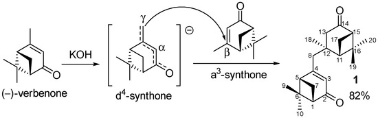 The interaction of verbenone with KOH without solvent led to the Michael addition of verbenone-extended enolate and provided its γ,β-dimer with an 82% preparative yield.