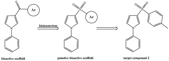 The 3-aroyl-1-phenyl-1H-pyrrole (Scheme 1) is an important bioactive scaffold (e.g., in aldose reductase [1] and tubulin polymerization [2] inhibitors). It is also known that the sulfonyl group is used as a bioisostere for the carbonyl group in medicinal chemistry [3] and, that, sulfone is one of the forty most frequent functional groups in a number of bioactive molecules [4]. Thus, we replaced the carbonyl group with a sulfone in the above bioactive scaffold and designed 3-arylsulfonyl-1-phenyl-1H-pyrrole (Scheme 1) as a putative pharmacophore structure [5]. This pharmacophore could possibly lead to molecules with improved pharmacodynamic/pharmacokinetic properties. Access to these types of compounds has been previously reported by either a cycloaddition reaction of substituted munchnones with arylsulfonyl alkynes [6] or from alkynylamines and sulfinic acids via a tandem oxidative/cyclization reaction [7]. In the present work, we studied a number of methods for the direct sulfonylation of 1-phenyl-1H-pyrrole 1, targeting 1-phenyl-3-tosyl-1H-pyrrole 2 as a representative structure.