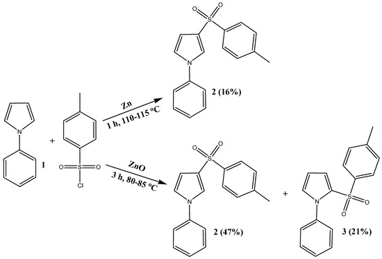 Attempts to introduce the tosyl group via substitution of 1-phenyl-1H-pyrrole 1 with TsOH/PPA [8], TsCl/Zn [9] or sodium p-toluenesulfinate/I2 [10] were unsuccessful. On the other hand, under solvent-free conditions, the reactions of 1 with TsCl/Zn [11] or TsCl/ZnO [12] gave the desired product 2 (Scheme 2). In the former reaction, the yield of 2 was low, and extensive decomposition was observed, while in the later reaction, 2 was isolated in moderate yield along with its isomer 3. The assignment of the structure of the two isomers (2 and 3) was based on the difference of the position of the signals of the hydrogen at the 4-position of the pyrrole ring in their 1H NMR spectrum (see Supplementary Materials). Specifically, in the 3-isomer 2, its signal was downfield/deshielded (6.69–6.52) compared to the 2-isomer 3 (6.38).