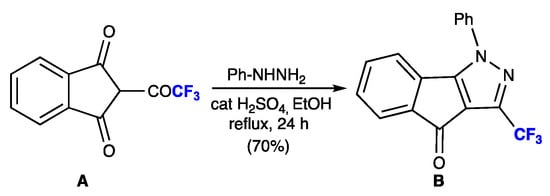 A 50 mL round-bottom flask equipped with a magnetic stirrer was charged with 25 mL ethanol, 2-acetyl-1,3-indanedione (2 mmol), and 4-trifluoromethylphenylhydrazine (2 mmol). Then, 1 drop of concentrated sulfuric acid was added while stirring. A reflux condenser was affixed, and the reaction mixture was refluxed at 78 °C for 48 h. The resulting solution was analyzed by TLC, evaporated to dryness under reduced pressure and the solid residue was neutralized with 15 mL of saturated Na2CO3. This solution was extracted with 3 × 5 mL of CH2Cl2, and the organic layer was dried over Na2SO4. The solvent was evaporated under reduced pressure to obtain 0.484 g (71% mass balance) of solid products and intermediates. The pyrazole mixture was purified by column chromatography (2× columns): 1st column using CH2Cl2 as the mobile phase, followed by a 2nd column using a gradient elution of 10–30% ethyl acetate/hexane.
