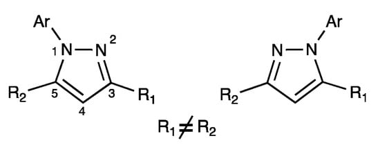 The product regiochemistry of the reaction depicted above is noteworthy, given that many investigations of pyrazole product formation have shown that conventional and microwave-mediated condensations between 1,3-diketones and hydrazines typically yield two regioisomers as shown in Figure 2, often in unequal proportions [,].