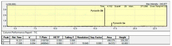 Following the TLC analysis of Run 1, the solvent was removed under reduced pressure. After workup, the crude product mixture (0.484 g, 71% mass balance) was subjected to the first chromatographic separation, which provided three major fractions containing mixtures of compounds 1/2, 3/4, and 5/6, respectively. Each major fraction was then combined, concentrated to dryness, and weighed: compounds 1/2 (0.122g, 18% yield), the pyrazole isomers (compounds 3/4) (0.320 g, 47% yield), and compounds 5/6 (0.020 g, 3% yield). No further attempts were made to isolate the intermediates 1, 2, 5, and 6. The fraction containing the pyrazole isomers was then analyzed by gas chromatography (Figure 3). Based on the areas of the two eluent peaks, 1b constituted 85.4% of the pyrazole isomeric mixture (0.273 g), while 1a comprised 14.6% of the pyrazole mixture (0.047 g). From these data, a 1b:1a ratio of 5.9:1 was determined.
