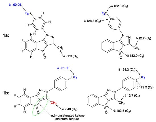 The 19F nuclear magnetic resonances observed for 1a and 1b at −60.06 and −61.00 ppm, respectively, are consistent with a -CF3 group attached to an aromatic ring, which generally varies from −60–−64 ppm []. That there is only a modest 19F chemical shift variation between the pyrazole isomers is also consistent with the fact that the electronic environments the CF3 groups encounter are very similar. Evidence in the 13C NMR of aromatic trifluoromethyl group presence for 1a was confirmed by CF3 (C1) resonance centered at 122.8 ppm, which appeared as a quartet with a 1JC-F = 285 Hz, as well as a C-CF3 (C2) resonance centered at 128.8 ppm, which appeared as a quartet with a 2JC-F = 32 Hz. For 1b, the CF3 (C1) resonance centered at 124.2 ppm appeared as a quartet with a 1JC-F = 272 Hz, as well as a C-CF3 (C2) resonance centered at 129.2 ppm, which appeared as a quartet with a 2JC-F = 32 Hz. The carbonyl carbon (C3) chemical shifts at 183.0 ppm (1a) and 183.5 ppm (1b) are consistent with a ketone conjugated with an aromatic ring. The pyrazolic CH3 (H4) singlet at 2.29 ppm for 1a is slightly upfield relative to the CH3 (H4) singlet for 1b at 2.48 ppm. The downfield shift of 1b’s H4 proton signal may be due in part to the extended conjugation and, therefore, deshielding imparted by the α,β unsaturated ketone structural feature circled in green in Figure 4. This extended conjugation may also influence the C4 carbon resonance of 1b (12.7 ppm), which is downfield relative to 1a’s C4 carbon resonance at 12.2 ppm. These chemical shift differences, while small, provide a rationale for the regioisomeric pyrazole assignments.