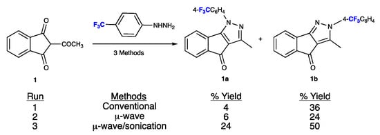 The regioisomeric pyrazoles 3-methyl-1-(4-(trifluoromethyl)phenyl)indeno[1,2-c]pyrazol-4(1H)-one (1a) and 3-methyl-2-(4-(trifluoromethyl)phenyl)indeno[1,2-c]pyrazol-4(2H)-one (1b) were prepared according to Scheme 1. Three runs were conducted to compare conventional reflux, microwave, and microwave-sonication methods for effectiveness.
