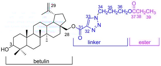 All reagents were purchased from Sigma-Aldrich (Darmstadt, Germany). The 28-[1-(3-hydroxypropyl)-1H-1,2,3-triazol-4-yl]carbonylbetulin 1 was obtained using the literature method []. The 1H and 13C NMR spectra were acquired on the Bruker Avance 600 spectrometer (Brucker Analytische Messtechnik GmbH, Rheinstetten, Germany) at 600 MHz and 150 MHz, respectively, as well as the HMBC and HSQC NMR spectra. The compound was dissolved in a deuterated chloroform (CDCl3) solvent. Chemical shifts (δ) were reported in ppm and J values in Hz. Multiplicity was designated as singlet (s), doublet (d), triplet (t), and multiplet (m). The protons of betulin, the triazole linker, and the ester moiety were denoted by the appropriate indices as beta, linker, and ester. High-resolution mass spectra were measured on the Bruker Impact II instrument (Brucker Analytische Messtechnik GmbH, Rheinstetten, Germany). Melting points were measured by the Electrothermal IA 9300 melting point apparatus.