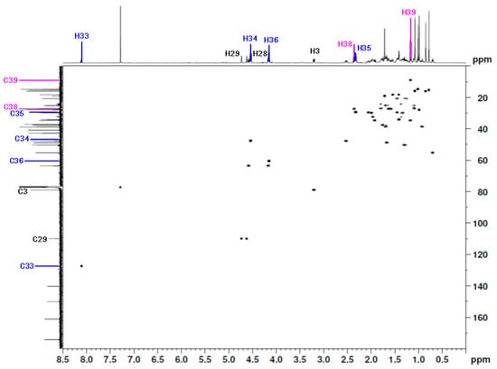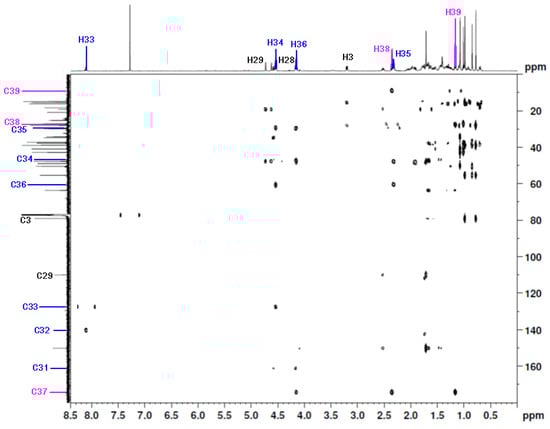 The signals of the triazole linker and the ester moiety were assigned on the basis of the HMBC correlation spectra (Table 1, Figure 4). The HMBC shows that the methyl group at the C39 position correlated with C38 and C37. The carbon atoms at the C37 and C39 positions were identified based on their correlation with the proton at the C38 position. Furthermore, the C37 carbon (δC 174.2 ppm) was correlated with the H39, H38, and H36 protons, respectively. The spectrum also showed the correlation of CH2 in position C34 with the carbon atom in position C35 (δC 29.4 ppm) and C33 (δC 127.5 ppm), respectively. The correlation between the proton signal at C33 (δC 8.10 ppm) and the carbon signal at C32 (δC 140.3 ppm) was also observed. The carbonyl group at the C31 position had a correlation with the carbon atom at the C28 (δC 63.6 ppm) position (Table 1, Figure 4).