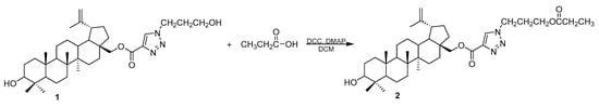 The triazole derivative 1 was synthesized from betulin in a multi-step reaction which is described in our earlier papers [,]. The treatment of compound 1 with propanoic acid in the presence of N,N’-dicyclohexylcarbodiimide (DCC), and 4-dimethylaminopyridine (DMAP) in dichloromethane (DCM) leads to ester 2 (Scheme 1).