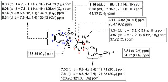 The structure of synthesized compound 3 is fully characterized by IR, 1H, 13C NMR, and LCMS spectra, and confirmed by single-crystal X-ray diffraction (See Supplementary Materials section). In the NMR spectrum of N-(3-(4-methoxyphenyl) isoxazolin-5-yl), 3 methylsaccharin showed a singlet on average at δ = 3.81 ppm identified as the methoxyl group, two doublets of doublet at 3.34 and 3.57 ppm for the two CH2-isoxazolinic protons, and two other doublets of doublet at 3.86 and 3.98 for the N–CH2 protons. This compound also showed a multiplet centered at 5.06 ppm for the H-isoxazolinic proton; thus, the presence of the signals between 7.02 and 8.34 ppm is attributable to the different aromatic protons. The 13C NMR spectrum of 3 exhibited characteristic signals at 41.13 ppm (N–CH2), 37.72 ppm (CH2isoxazoline), 76.47 ppm (CHisoxazoline), 54.77 ppm (OMe), 158.34 ppm (C=O) and 113.71 ppm, 120.96 ppm, 121.08 ppm, 124.70 ppm, 125.64 ppm, 127.73 ppm, 134.80 ppm, 135.42 ppm, 136.15 ppm, 155.62 ppm, and 160.20 ppm, attributable to aromatic carbons (Figure 1). The structure of 3 was further confirmed by IR and mass spectrometry.
