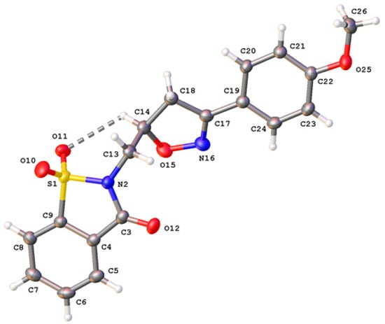 The crystal was kept at 293(2) K during data collection. Using Olex2 [], the structure was solved with the SHELXT [] structure solution program using Intrinsic Phasing and refined with the SHELXL [] refinement package using least-squares minimization. The N-(3-(4-methoxyphenyl)isoxazolin-5-yl)methylsaccharin crystallizes in the triclinic space group P-1 with one molecule in the asymmetric unit (Figure 2). The molecule is not planar, as indicated by the torsion angles N2–C13–C14–O15 [−55.1(2)°] and C3–N2–C13–C14 [93.9(2)°]. The best plane through the isoxazoline ring (O15/N16/C17/C18/C14; r.m.s. deviation = 0.076 Å) makes a dihedral angle of 27.88(9)° with the best plane through the benzoisothiazole ring (C3-C9/S1/N2; r.m.s. deviation = 0.009 Å).