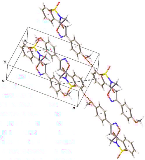 Partial crystal packing of N-(3-(4-methoxyphenyl)isoxazolin-5-yl)methylsaccharin showing C–H…O (red dashed lines) and π…π interactions (gray dashed lines).