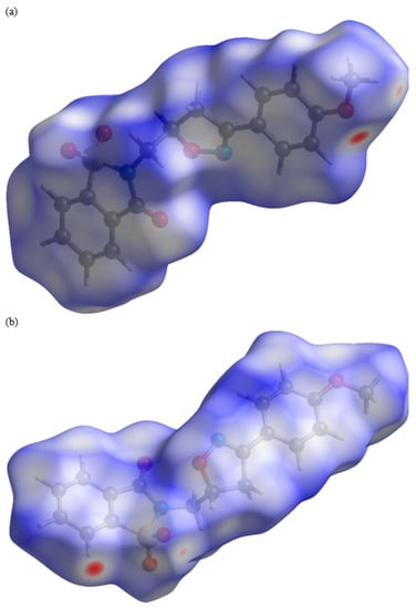 View of the three-dimensional Hirshfeld surface face 1 (a) and 2 (b) of the title compound, plotted on dnorm in the range of −0.1656 to 1.2318 a.u.