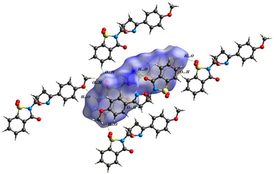 The three-dimensional dnorm surfaces of the crystal structure illustrate the presence of several bright red spots, which correspond to the hydrogen bonding interactions, as shown in Figure 5.