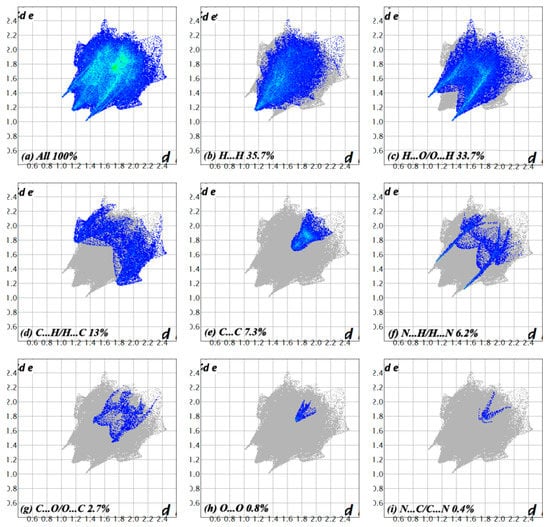 The overall two-dimensional fingerprint plot [] is shown in Figure 6a, while those delineated into H…H, H…O/O…H, H…C/C…H, C…C, H…N/N…H, C…O/O…C, O…O, and C…N/N…C contacts are illustrated in (Figure 6b–g), respectively, together with their relative contributions to the Hirshfeld surface (HS). The most important interaction is H…H, contributing 35.7% to the overall crystal packing, which is reflected in Figure 6b as widely scattered points of high density due to the large hydrogen content of the molecule, with a tip at de = di = 1.15 Å. In the presence of O–H interactions, the pair of characteristic wings in the fingerprint plot delineated into H…O/O…H contacts (33.7% contribution to the HS) (Figure 6c) has tips at de + di = 2.41 Å. The pair of scattered points of spikes in the fingerprint plot delineated into C…H/H…C (Figure 6d) (13%) have tips at de + di = 2.95 Å. The C…C contacts (Figure 6e) (7.3%) have tips at de + di = 3.49 Å. The N…H/H…N contacts (Figure 6f) contribute 6.2% to the HS and appear as a pair of scattered points of spikes with tips at de + di = 2.63 Å. The C…O/O…C contacts (Figure 6g) contribute 2.7% to the HS and appear as a pair of scattered points of spikes with tips at de + di = 3.32 Å. The O…O contacts (Figure 6h) contribute 0.8% to the HS and appear as a pair of scattered points of spikes with a tip at de + di = 3.43 Å. Finally, the N…C/C…N contacts (Figure 6i) make only a 0.4% contribution to the HS and have a low-density distribution of points.