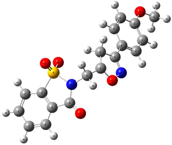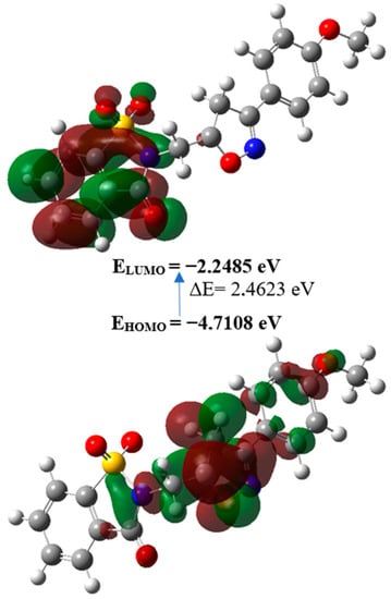 The structure in the gas phase of N-(3-(4-methoxyphenyl)isoxazolin-5-yl)methylsaccharin was optimized by means of density functional theory. The density functional theory calculation was performed by the hybrid B3LYP method and the 6–311 G (d,p) basis set, which is based on Becke’s model [] and considers a mixture of the exact (Hartree–Fock) and density functional theory exchange utilizing the B3 functional, together with the LYP correlation functional []. After obtaining the converged geometry, the harmonic vibrational frequencies were calculated at the same theoretical level to confirm that the number of imaginary frequencies is zero for the stationary point. Both the geometry optimization and harmonic vibrational frequency analysis of the title compound were performed with the GAUSSIAN 09 program []. As a result of these calculations, many quantum chemical parameters have been found. Each parameter describes a different chemical property of molecules []. The obtained results were given comparatively, and the optimized structure is shown in Figure 7. There are some differences between experimental and computed results due to the phase difference (experimental results in solid and theoretical ones in the gas phase). In this context, we have not found the critical point to confirm the suggestions concerning the intramolecular hydrogen bond C14–H14…O11. Despite this, fairly consistent results were obtained. The theoretical and experimental results related to bond lengths and angles are summarized in Table 1. Calculated numerical values for the title compound, including electronegativity (χ), hardness (η), ionization potential (I), dipole moment (μ), electron affinity (A), electrophilicity (ω), and softness (σ), are collated in Table 2. Among the calculated parameters of the molecules, the highest occupied molecular orbital (HOMO) and lowest unoccupied molecular orbital (LUMO) parameters are more important than the others [,]. The electron transition from the HOMO to the LUMO energy level is shown in Figure 8. The green and brown regions of the figure represent molecular orbitals with completely opposite phases. The positive phase of the molecule is shown in green color and the negative phase in brown color.The HOMO and LUMO are localized in the plane extending over the whole N-(3-(4-methoxyphenyl)isoxazolin-5-yl)methylsaccharin system. The energy band gap [ΔE = ELUMO − EHOMO] of the molecule is 4.9266 eV, and the frontier molecular orbital energies, EHOMO and ELUMO, are −5.8170 and −0.8904 eV, respectively.