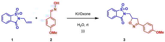 In a pear-shaped flask, N-allyl saccharin 1 (1 mmol), 4-methoxybenzaldoxime (1 mmol) 2, KI (20 mol%), and oxone (2 mmol) were added in water (10 mL) and ultrasonicated at 25 °C using the ultrasonic probe for 20 min. The completion of the reaction was monitored by TLC. The mixture was extracted with ethyl acetate (3 × 15 mL), then dried over Na2SO4 and concentrated in vacuum. The residue was purified by recrystallization in EtOH to afford the pure N-(3-(4-Methoxyphenyl) isoxazolin-5-yl) methylsaccharin 3.