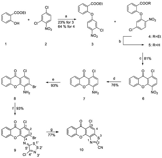 Commercially available ethyl salicylate (1) was used as a starting material which, upon treatment with 2,4-dichloronitrobenzene (2), resulted in a mixture of isomeric esters 3 and 4 (23% and 64%, respectively), which were separated by column chromatography [11]. Each ester was identified by 1H NMR and 13C NMR spectra, using both direct and long-range heteronuclear correlation experiments (HMQC and HMBC). The structural identification was based on the observation that C-1′ of compound 3 exhibits a 2J coupling with two aromatic protons (i.e., H-2′ and H-6′) whilst C-1′ of compound 4 exhibits a 2J coupling only with H-6′ (Scheme S1, Supplementary Material). Ester 4 was then saponified under mild conditions, and the resulting carboxylic acid was cyclized to the corresponding xanthone 6 upon treatment with PPA. Reduction of the nitro derivative 6 to the aniline 7, followed by bromination upon treatment with Br2 in acetic acid, resulted in the bromoxanthone 8. The next step concerns the preparation of 5-chloro-6-oxo-6H-xantheno[4,3-d]thiazole-2-carbonitrile (10). For this purpose, 8 was reacted with Appel’s salt [12,13,14] to provide the N-arylimino-1,2,3-dithiazole 9, which was heated at 160 °C, using CuI as a catalyst, with Start E Milestone MW apparatus.