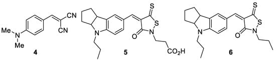 - Tanaka, E.; Mikhailov, M.S.; Gudim, N.S.; Knyazeva, E.A.; Mikhalchenko, L.V.; Robertson, N.; Rakitin, O.A. Structural features of indoline donors in D–A-π-A type organic sensitizers for dye-sensitized solar cells. Mol. Syst. Des. Engl. 2021, 6, 730–738. [Google Scholar] [CrossRef]