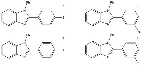 The prepared 2-arylbenzimidazoles are isostructural in pairs (para-bromine with para-iodine and meta-bromine with meta-iodine) and produce monoclinic crystals which do not contain solvent molecules. Compounds 1 and 3 are also isostructural to 2-(4-chlorophenyl)-1-phenyl-benzimidazole [28] and 2-(4-bromophenyl)-1-phenyl-benzimidazole whose crystal structure was reported as a CSD private communication (ref code CINTIE). Unit cell volume is slightly increased (by a factor of 1.02) upon the replacement of bromo- by iodo-substituent while the position of the substituent has a smaller effect on the cell volume (less than 1% increase, see Table S1). The molecular structures of halogenated benzimidazoles 1–4 are shown in Figure 2.