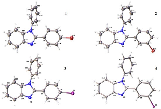 Molecular structures of halogen-substituted 2-arylbenzimidazoles (compounds 1–4). Displacement ellipsoids are shown at 50% probability level.